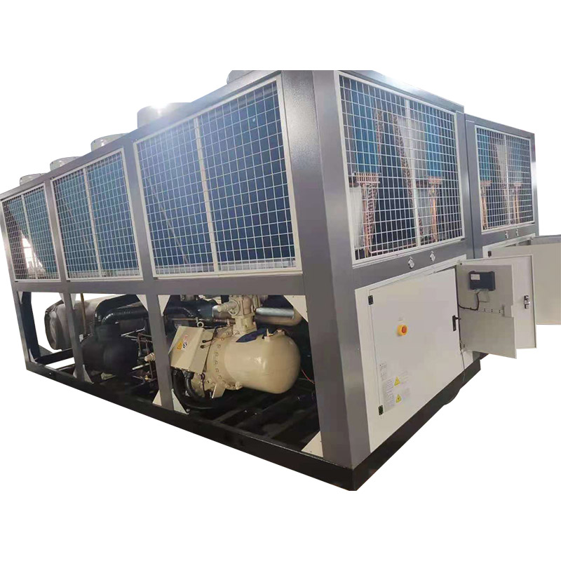 Zračno hlajeni vijačni hladilnik 3PH-200V-50HZ 60 KM je hladilnik s certifikatom CE. Zračno hlajeni vijačni hladilnik uporablja vijačni kompresor mednarodne znamke in je opremljen z visokokakovostnimi in visoko zmogljivimi bakrenimi cevmi za izdelavo kondenzatorjev, uparjalnikov in svetovno znanih krmilnih komponent, tako da ima enota majhnost, nizek hrup, Prednosti velike energije, dolge življenjske dobe, enostavnega upravljanja itd., njegova lepa in izvrstna zasnova oblike ter zanesljiva in stabilna kakovost z visokim izkoristkom so izjemne med podobnimi izdelki. Nestandardni tip je mogoče prilagoditi za ultra nizke temperature -50 °C.